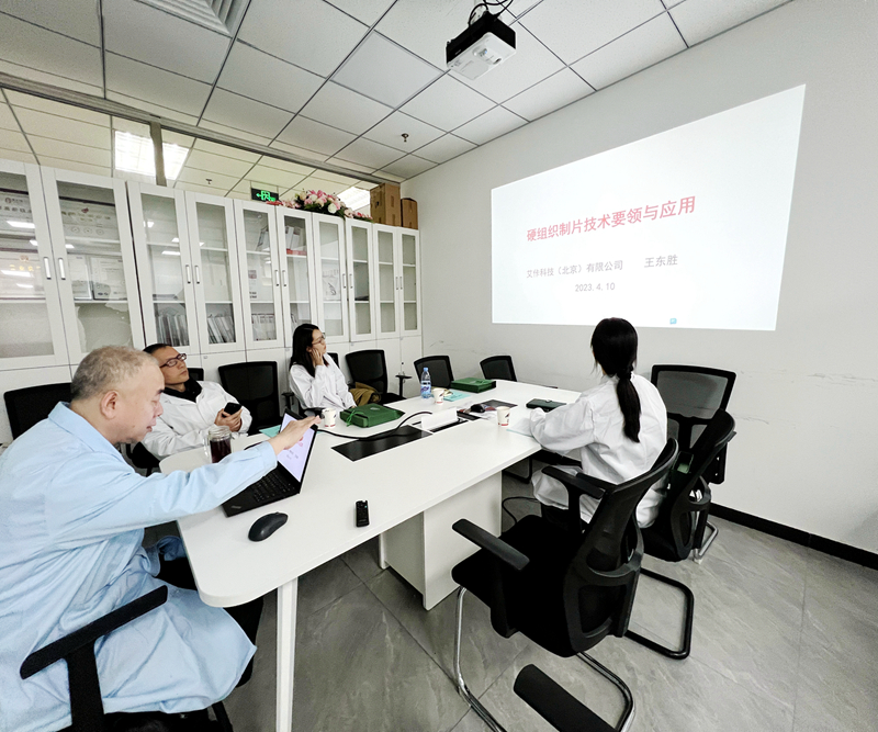 開班首日,北京共贏聯(lián)盟國(guó)際科技有限公司總經(jīng)理?xiàng)钭优繛榇舜闻嘤?xùn)班開班致辭,她向遠(yuǎn)道而來的老師們表達(dá)了熱烈的歡迎。接著,實(shí)驗(yàn)室技術(shù)總監(jiān)王東勝為接受培訓(xùn)的老師們進(jìn)行開班動(dòng)員。他介紹了業(yè)內(nèi)硬組織病理制片技術(shù)發(fā)展動(dòng)態(tài),以及公司組織病理實(shí)驗(yàn)室的發(fā)展歷程、技術(shù)團(tuán)隊(duì)、核心技術(shù)和服務(wù)項(xiàng)目等內(nèi)容。同時(shí),王東勝老師還做了《與硬組織制片相關(guān)的解剖與形態(tài)學(xué)簡(jiǎn)述》的主題分享,分享了自己在硬組織制片領(lǐng)域中,在標(biāo)本取材、磨片要領(lǐng)和染色等方面關(guān)于解剖、制片與形態(tài)學(xué)的經(jīng)驗(yàn)。張文隆工程師則詳細(xì)介紹了硬組織切磨片系統(tǒng)和制片流程,并對(duì)每一個(gè)制片環(huán)節(jié)都做了詳細(xì)講解。隨后,技術(shù)總監(jiān)王東勝帶領(lǐng)老師們參觀實(shí)驗(yàn)室并進(jìn)行相應(yīng)介紹。