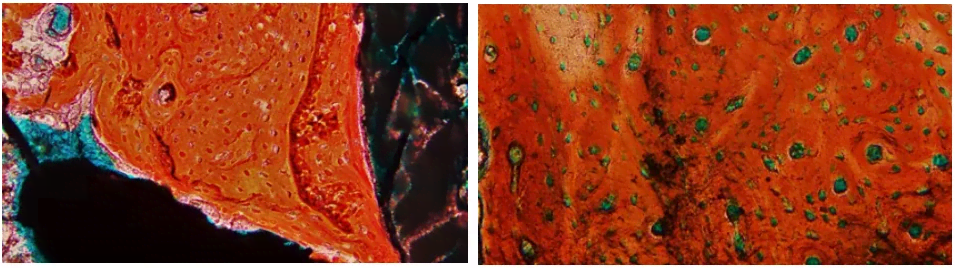 Goldner's 三色染色法(圖3)較適用于骨缺損修復(fù)后新骨形成的過程觀察,在Goldner's三色染色中,礦化骨被染成綠色,類骨質(zhì)被染成橙色或橙紅色,而軟骨被染成紫色或藍(lán)色。韓雪等[7]在經(jīng)微弧氧化堿熱處理后修復(fù)種植體周圍骨缺損的愈合情況的研究中,采用犬下頜前磨牙區(qū)制備骨缺損,修復(fù)種植體植入缺損區(qū),制備不脫鈣骨組織病理切片,經(jīng)Goldner's三色染色,觀察了種植體周圍骨缺損區(qū)的修復(fù)情況。楊力碩等[8] 在自體牙骨粉與異種牛骨粉修復(fù)牙槽骨缺損的對比研究中,選取家兔上頜中切牙牙槽窩為植入部位,制備不脫鈣骨組織病理切片,采用Goldner's三色染色法,觀察了骨組織及類骨質(zhì)的形成情況,在該實驗中,通過不同周期骨粉修復(fù)骨組織的Goldner's 三色染色對比,可明顯觀察到組織切磨面的新生骨組織的形成情況,在4周時,被染成藍(lán)色的新生骨面積大,而在8周和12周的切片中,被染成藍(lán)色的新生骨面積逐漸減小,被深染的成骨細(xì)胞代替,然后與對照組進(jìn)行比較,評價其新骨的形成速率。Goldner's三色染色法是基于染料分子大小對結(jié)構(gòu)致密、滲透性低或結(jié)構(gòu)疏松、滲透性高的骨組織穿透效果不同進(jìn)行染色的方法。因Goldner's三色染色法具有獨特的染色優(yōu)勢,所以被作為含植入物的骨組織的修復(fù)中比較常用的評價方法。但是,Goldner's三色染色法中,新骨的顏色與Bio-oss骨粉的成骨材料顏色相近,所以,如果植入物是Bio-oss骨粉,則在觀察骨修復(fù)時應(yīng)慎重選擇此方法。