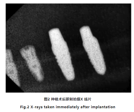 將60枚植體編號(hào)1~60號(hào),按隨機(jī)分配的原則(隨機(jī)數(shù)字表)植入6只Beagle犬的脛骨中,每只Beagle犬每側(cè)脛骨植入5枚種植體。全麻前準(zhǔn)備:術(shù)前禁食12h;術(shù)前0.5h肌注青霉素鈉80萬(wàn)U以預(yù)防感染。種植手術(shù):氣管插管下,速眠新(0.04~0.08mg/kg) 對(duì)Beagle犬進(jìn)行后腿肌肉注射。全麻起效后,常規(guī)消毒鋪巾,后腿阿替卡因1.7mL浸潤(rùn)麻醉,切開(kāi)、翻瓣、暴露脛骨外側(cè),逐級(jí)預(yù)備種植窩,植入種植體,安放愈合帽。對(duì)位縫合創(chuàng)口,種植術(shù)后即刻拍攝X線(xiàn)片,觀(guān)察植入位置、角度(圖2)。術(shù)后常規(guī)抗感染處理。
