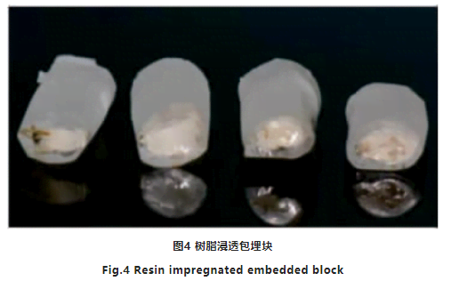 1.2.4 不脫鈣種植體骨切片的制備和染色用4%的甲醛固定浸泡,4℃冰箱保存72h,然后用70%乙醇溶液浸泡。修整帶種植體的標(biāo)本,標(biāo)本大小約5mm×15mm×10mm,在Exakt510 脫水儀中使用70%~100%的乙醇溶液梯度脫水,在Exakt520光固化包埋機(jī)中進(jìn)行樹(shù)脂浸透包埋和聚合(圖4)。完成聚合反應(yīng)后,準(zhǔn)備A、B 兩張載玻片,用Technovit 4000粘接劑把標(biāo)本包埋塊粘合于載玻片A上,將載玻片A吸附于切片機(jī)夾具上,修整組織塊,使用Exakt 400CS 磨片機(jī)對(duì)標(biāo)本表面進(jìn)行拋光,然后用Technovit-7210VLC膠水將載玻片B粘合于標(biāo)本的拋光面?zhèn)?,形成兩?cè)載玻片、中間組織塊的雙夾結(jié)構(gòu)。將載玻片A吸附在Exakt 300 CP a切片機(jī)夾具上,將切割厚度設(shè)定為150~200μm,切下載玻片B側(cè)約150μm厚的切片,使用SiC和Al2O3砂紙自動(dòng)磨片,設(shè)置厚度為30μm,再用細(xì)砂紙進(jìn)行切片表面拋光,最終制作出厚度約為30μm的光滑種植體骨磨片。將切磨好的骨切片使用雙蒸水進(jìn)行超聲清洗10min,自然干燥后用亞甲基藍(lán)-酸性品紅色,樹(shù)脂封片。