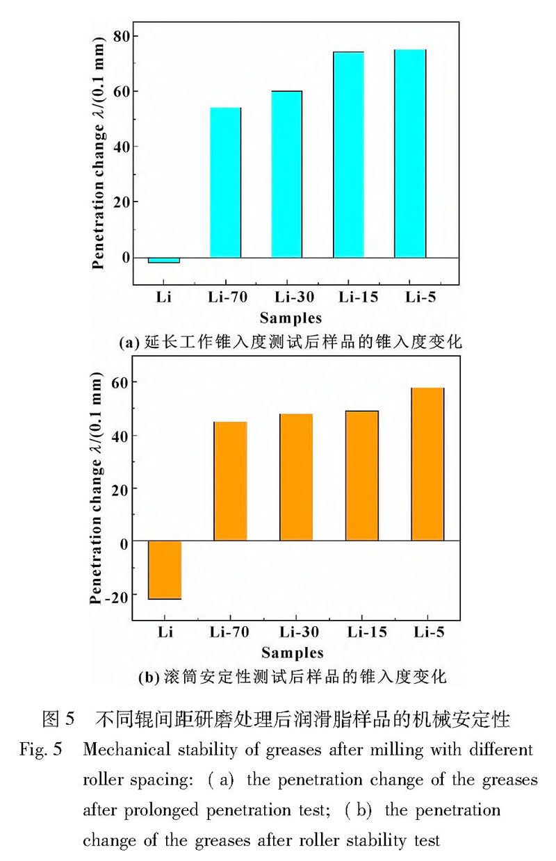 潤(rùn)滑脂在服役過程中的剪切作用下,其錐入度會(huì)逐漸變大。錐入度的變化代表潤(rùn)滑脂的機(jī)械安定性,為考察研磨處理對(duì)潤(rùn)滑脂機(jī)械安定性的影響,文中分別采用延長(zhǎng)工作錐入度測(cè)試儀和滾筒安定性測(cè)試儀對(duì)潤(rùn)滑脂樣品進(jìn)行測(cè)試。圖5 所示為潤(rùn)滑脂樣品的機(jī)械安定性測(cè)試后錐入度變化的柱狀圖,圖5 (a) 所示為采用延長(zhǎng)工作錐入度測(cè)試儀測(cè)試后潤(rùn)滑脂樣品錐入度的變化,圖5 (b) 所示為采用滾筒安定性測(cè)試儀測(cè)試后各潤(rùn)滑脂樣品錐入度的變化。可以看出,未研磨處理的鋰基潤(rùn)滑脂Li 的錐入度在測(cè)試后減小,而研磨處理后的潤(rùn)滑脂樣品在測(cè)試后錐入度顯著升高,且隨著研磨輥間距的減小,鋰基潤(rùn)滑脂的錐入度變化值逐漸增大。這是由于未研磨潤(rùn)滑脂中的稠化劑分散不均勻,團(tuán)聚嚴(yán)重,剪切作用的過程起到了分散的作用,使得稠化劑趨于均勻分散,增大了稠化劑和基礎(chǔ)油相互作用的界面,增強(qiáng)了稠化劑和基礎(chǔ)油之間的作用力,從而潤(rùn)滑脂錐入度變小[14]。研磨處理后的潤(rùn)滑脂在測(cè)試后錐入度變大是在機(jī)械安定性測(cè)試過程中的較強(qiáng)剪切作用破壞了稠化劑的纖維結(jié)構(gòu)造成的。