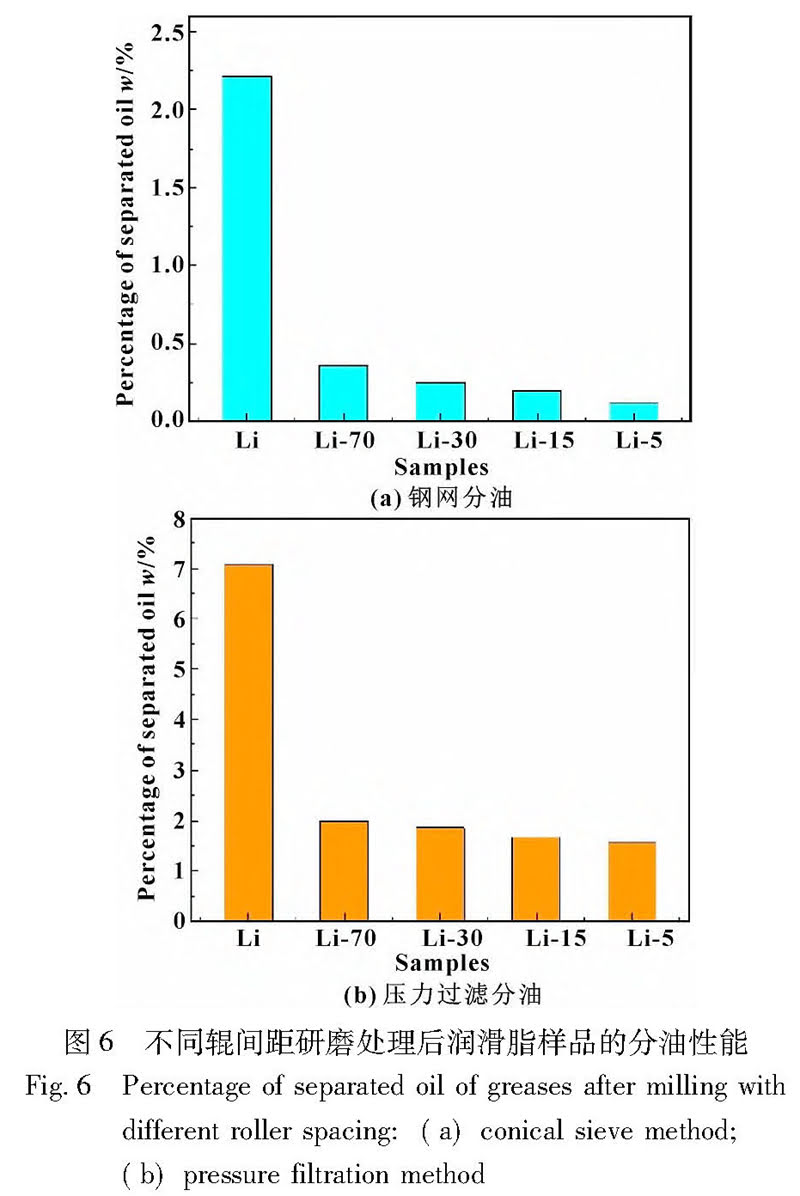潤(rùn)滑脂的分油性能測(cè)試是其膠體安定性表征的重要方法,文中采用2種分油性能的測(cè)試方法評(píng)價(jià)不同輥間距研磨處理的潤(rùn)滑脂在溫度、載荷等作用下的膠體安定性,分別為鋼網(wǎng)分油法和壓力過濾分油法。圖6 所示為潤(rùn)滑脂樣品的分油曲線,圖6 (a) 所示為潤(rùn)滑脂樣品鋼網(wǎng)分油的質(zhì)量分?jǐn)?shù),圖6 (b) 所示為潤(rùn)滑脂樣品壓力過濾分油的質(zhì)量分?jǐn)?shù)??梢钥闯觯刺幚淼臐?rùn)滑脂Li 的分油質(zhì)量分?jǐn)?shù)較高,研磨處理后的潤(rùn)滑脂樣品的分油質(zhì)量分?jǐn)?shù)顯著降低,且隨著研磨處理輥間距的變小,分油質(zhì)量分?jǐn)?shù)逐漸減低。這是由于未研磨潤(rùn)滑脂Li 的稠化劑團(tuán)聚嚴(yán)重,對(duì)基礎(chǔ)油束縛能力較弱造成的; 隨著研磨輥間距的變小,潤(rùn)滑脂稠化劑的均勻分散程度提高,對(duì)基礎(chǔ)油的束縛能力逐漸增強(qiáng),所以分油質(zhì)量分?jǐn)?shù)降低[17,23]。