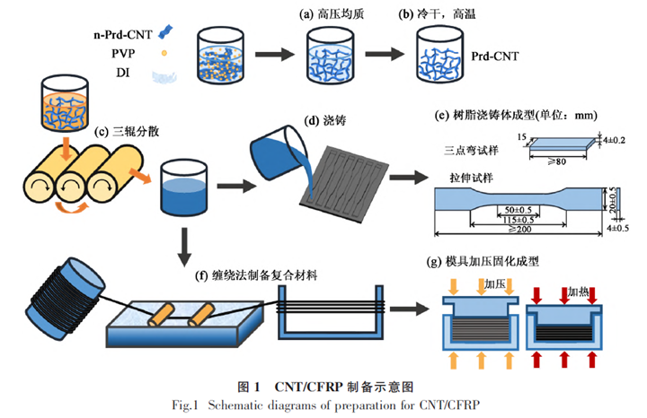CNT/CFRP 的制備(圖1(f)和1(g)):使用纏繞法制備CFRP, 將炭纖維通過n-Prd-CNT 和Prd-CNT改性樹脂的膠槽中,使樹脂對(duì)纖維充分浸潤(rùn),并將其纏繞至U 型桿上,根據(jù)炭纖維體積分?jǐn)?shù)為65%設(shè)計(jì)纏繞圈數(shù),將纏繞好的纖維樣品固定于300 mm×10 mm×2 mm 的模具內(nèi)熱壓固化,固化工藝同上,得到n-Prd-CNT/CFRP 和Prd-CNT/CFRP。