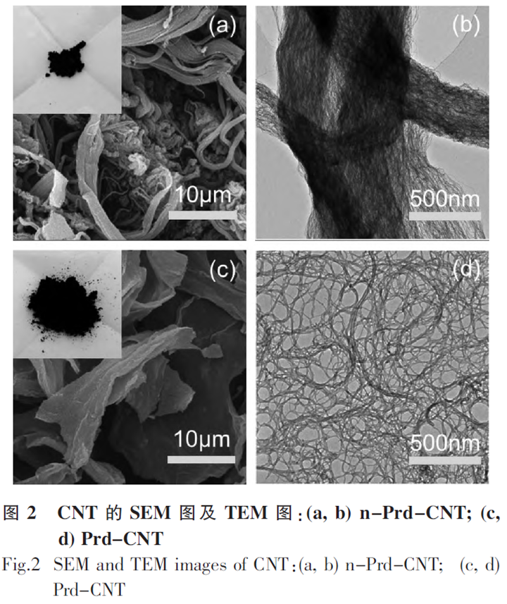 CNT的微觀形貌如圖2,從低倍率SEM 圖可以看出(圖2(a)),n-Prd-CNT呈現(xiàn)嚴(yán)重纏繞且雜亂無序的團(tuán)簇狀。此外,從高倍率TEM 圖可以看出(圖2(b)),n-Prd-CNT為結(jié)構(gòu)緊密且寬窄不一的條帶狀。圖2(a)和2(c)左上角小圖為質(zhì)量為0.1g時(shí)n-Prd-CNT與Prd-CNT的粉體,可以看出經(jīng)過預(yù)分散處理后,相同質(zhì)量下CNT體積明顯變大。這是因?yàn)楦邏壕|(zhì)機(jī)以湍流分散[30]的方式打開了CNT的大尺寸團(tuán)聚,同時(shí)分散液中的分散劑PVP包覆在CNT 表面,阻止了CNT的再次團(tuán)聚,經(jīng)過冷凍干燥及高溫處理后, 在低倍率SEM 圖中可以看到Prd-CNT為疏松的片層結(jié)構(gòu)(圖2(c))。在高倍率的TEM 觀察下(圖2(d)),Prd-CNT網(wǎng)絡(luò)疏松,管間團(tuán)聚現(xiàn)象得到了明顯地改善。
