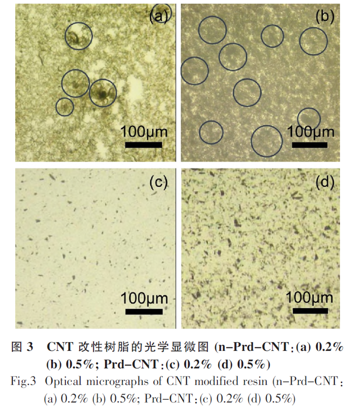 光學(xué)顯微鏡已被廣泛用于系統(tǒng)地表征CNT在環(huán)氧樹脂中的分散狀態(tài)[31]。將CNT改性樹脂滴于載玻片上,使用3D 共聚焦顯微鏡觀察,如圖3,深色部分為CNT。在CNT 質(zhì)量分?jǐn)?shù)為0.2%時(shí)(圖3(a)),n-Prd-CNT多以纏繞起來的幾十微米大小的團(tuán)簇存在于樹脂中,當(dāng)CNT 質(zhì)量分?jǐn)?shù)為0.5%時(shí)(圖3(b)),團(tuán)簇明顯增多,且團(tuán)簇之間結(jié)構(gòu)緊密,基本看不到透過的光線,CNT 分布不均勻。與n-Prd-CNT改性樹脂相比,在Prd-CNT改性樹脂內(nèi)觀察不到大尺寸纏繞的團(tuán)聚體,當(dāng)質(zhì)量分?jǐn)?shù)為0.5%時(shí)(圖3(d)),CNT仍舊均勻分布且無明顯的團(tuán)聚現(xiàn)象。