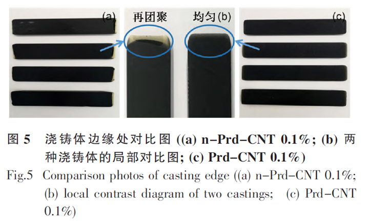 CNT改性樹脂澆鑄體試樣邊緣處對(duì)比如圖5所示,對(duì)于質(zhì)量分?jǐn)?shù)為0.1%的n-Prd-CNT 改性樹脂澆鑄體(圖5(a)),在邊緣處可以明顯看到CNT向內(nèi)部團(tuán)聚,能夠直接觀察到邊緣區(qū)域的CNT 分布不均勻。對(duì)于相同含量的Prd-CNT 改性樹脂澆鑄體(圖5(c)),邊緣處的顏色均勻。CNT改性樹脂澆鑄體固化時(shí),在樹脂凝膠前,溫度的提高會(huì)使CNT受熱運(yùn)動(dòng)發(fā)生再團(tuán)聚以及沉降。而預(yù)分散處理有效地改善了CNT在樹脂中的分散性,提高了CNT在樹脂升溫固化階段的穩(wěn)定性。