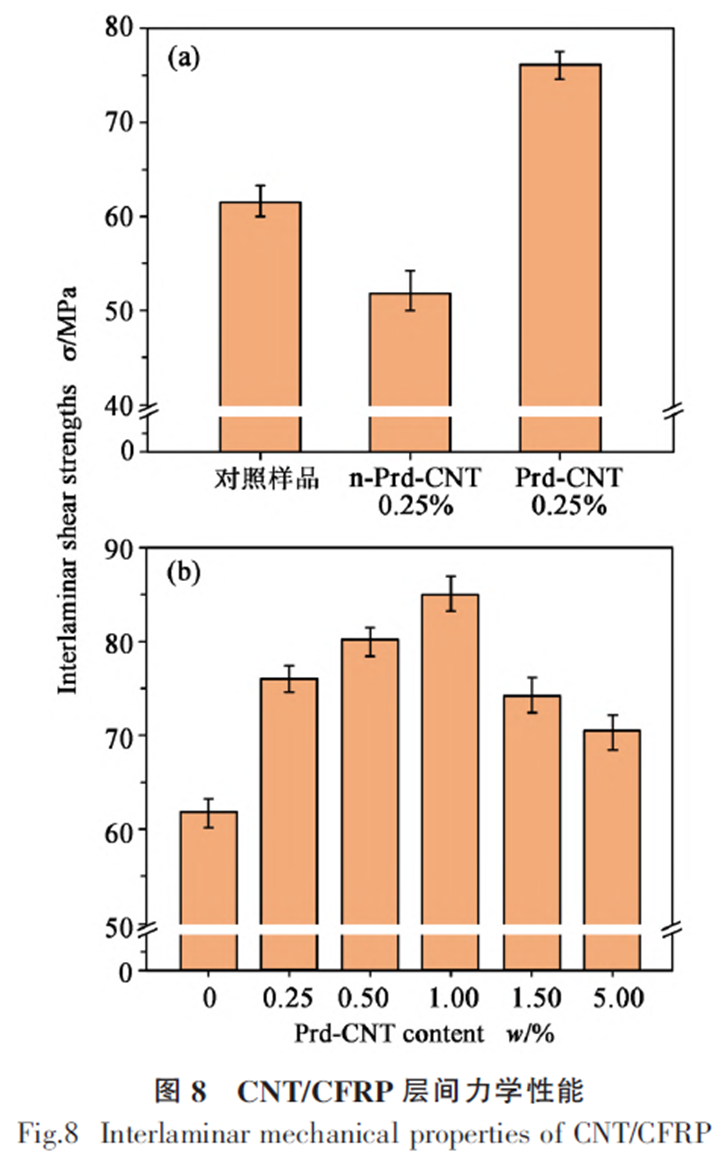 添加n-Prd-CNT和Prd-CNT制備CNT/CFRP的層間剪切性能如圖8。在復(fù)合材料整體受力破壞時(shí),CNT 能夠傳遞載荷,阻礙裂紋的擴(kuò)展,從而改善CNT/CFRP的力學(xué)性能[36]。對(duì)于n-Prd-CNT/CFRP,CNT 質(zhì)量分?jǐn)?shù)為0.25%時(shí), 復(fù)合材料的層間剪切強(qiáng)度為52.1 MPa, 較對(duì)照樣品的層間剪切強(qiáng)度(61.7MPa)降低了15.6%。對(duì)于Prd-CNT/CFRP,在CNT質(zhì)量分?jǐn)?shù)同為0.25%時(shí), 復(fù)合材料的層間剪切強(qiáng)度提高到76.0 MPa。復(fù)合材料的層間剪切強(qiáng)度隨Prd-CNT 含量的增加呈現(xiàn)先升高后降低的趨勢(shì)(圖8(b)),在質(zhì)量分?jǐn)?shù)為1.00%時(shí),復(fù)合材料的層間剪切強(qiáng)度達(dá)到了最高值85.1 MPa,較對(duì)照樣品的層間剪切強(qiáng)度提高了37.9%。