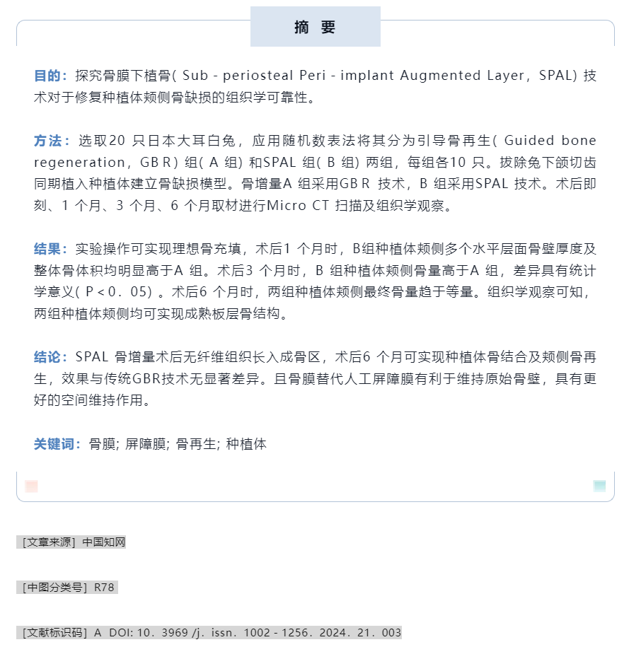 應(yīng)用SPAL 技術(shù)的愈合期間無(wú)纖維組織長(zhǎng)入成骨區(qū),術(shù)后6 個(gè)月可實(shí)現(xiàn)種植體骨結(jié)合及頰側(cè)骨再生,效果與放置屏障膜的GBR技術(shù)無(wú)顯著差異。且骨膜替代人工屏障膜有利于維持原始骨壁,且具有更好的空間維持作用。