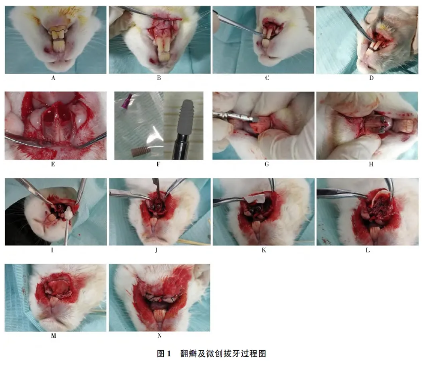 ②翻瓣及微創(chuàng)拔牙: 于實(shí)驗(yàn)動(dòng)物下頜兩顆切齒的頰側(cè)齦頰溝處再次局部注射阿替卡因腎上腺素注射液行浸潤(rùn)麻醉,1 ~ 2 min 后,使用15c 刀片做下頜切齒的齦溝內(nèi)切口,切斷下頜正中系帶與牙面的附著。刀片盡量與牙體長(zhǎng)軸平行,避免損傷骨膜組織。再在兩顆切齒遠(yuǎn)中做水平附加切口,長(zhǎng)度約2 mm,如圖1A。